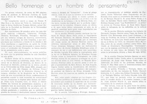 Bello homenaje a un hombre de pensamiento [artículo] / V. El Mercurio (Diario : Valparaíso, Chile)-- oct. 15, 1970, p. 4. .