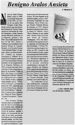 Benigno Avalos Ansieta [artículo] / F. Medina C. Diario Atacama (Atacama, Chile)-- ene. 9, 1994, p. 2. il. .