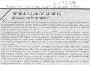Benigno Avalos Ansieta descansa en la eternidad [artículo] Safo (Santiago) no. 76 (mayo. jun. 2002) p. 16 .