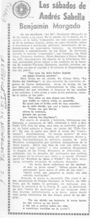 Benjamín Morgado [artículo] / Andrés Sabella. La Estrella del Norte (Antofagasta, Chile)-- feb. 2, 1974, p. 6. .
