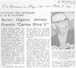 Byron Gigoux James, Premio "Carlos Silva V." [artículo] El Mercurio (Santiago, Chile)-- dic. 14, 1977, p. 30. retr. .