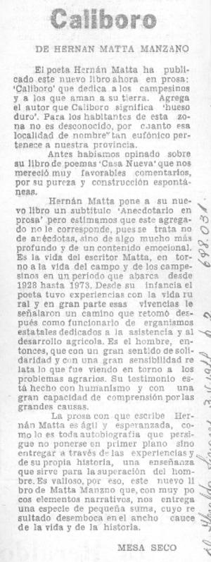 Caliboro [artículo] / Manuel Francisco Mesa Seco. El Heraldo (Linares, Chile)-- mayo 3, 1977, p. 2. .