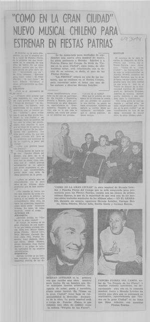 Como en la gran ciudad" nuevo musical chileno para estrenar en fiestas patrias: [entrevista] [artículo] La Prensa (Santiago, Chile)-- ago. 19, 1971, p. 16. retr. .