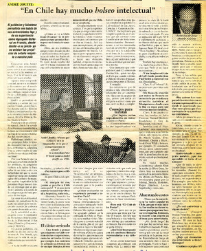 En Chile hay mucho bolseo intelectual" : [Entrevista] [artículo] / Jorge Abasolo Aravena. La Tribuna (Los Angeles, Chile)-- nov. 13, 2000, p. 4. retr. .