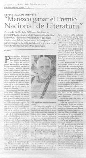Entrevista a Jaime Valdivieso : "Merezco ganar el Premio Nacional de Literatura" [artículo] / Paz Arrese. El Mercurio (Diario : Santiago, Chile)-- jun. 10, 2005, p. 5 (suplemento "Revista de libros") .
