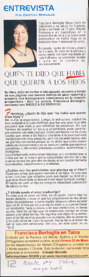 Entrevista [artículo] / por Cristián Bernales. Maule a su servicio (Chile) N° 4, mayo 2005, p. 12. .