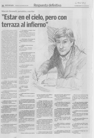 Estar en el cielo, pero con terraza al infierno": [entrevista] [artículo] El Mercurio (Valparaíso, Chile)-- mar. 30, 2003, p. 16. retr. .