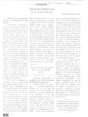 Hernán Miranda en la Armonía del caos (entrevista) [artículo] Ricardo Gómez López.