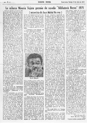La cubana Nivaria Tejera premio de novela "Biblioteca Breve" 1971 (entrevista) [artículo] / Jean Miche Fossey. Vanguardia Dominical (Revista : Bucaramanga, Colombia)-- jul. 11, 1971, p. 6. .