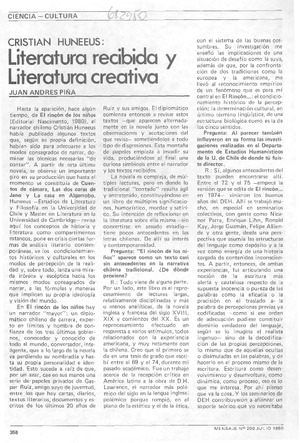 Literatura recibida y lieratura creativa : [Entrevista] [artículo] / Juan Andrés Piña. Mensaje (Santiago, Chile)-- no. 290 (jul. 1980) p. 358-360. retr. .