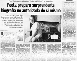 Poeta prepara sorprendente biografía no autorizada de sí mismo : [entrevistas] [artículo] / Rodrigo Castillo R. Las Últimas Noticias (Diario : Santiago, Chile)-- ene. 24, 2004, p. 35. retr. .