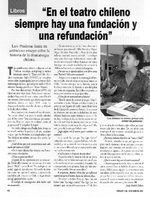 "En el teatro chileno siempre hay una fundación y una refundación" (entrevista) [artículo] / Jorge Andrés Palma. Ercilla (Revista : Chile)-- no. 3311 ene. 15, 2007) p. 62. .