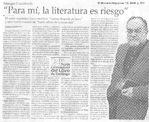 "Para mí, la literatura es riesgo" [entrevista] [artículo] / Carolina Andonie Dracos El Mercurio (Diario : Santiago, Chile) nov. 10, 2004, p. C17. .