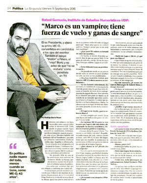 Rafael Gumucio, Instituto de Estudios Humorísticos UDP: "Marco es un vampiro; tiene fuerza de vuelo y ganas de sangre" [artículo] : Rafael Gumucio ; [entrevistado] por Rodrigo Barría Reyes ; [fotografía por] Claudio Cortes. La Segunda (Diario : Santiago, Chile)-- sept. 9, 2016, p. 24. .
