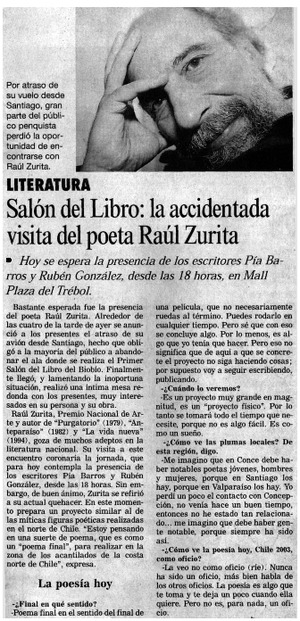 Salón del libro: la accidentada visita del poeta Raúl Zurita [entrevistas] [artículo] : El Sur (diario : Concepción, Chile)-- oct. 25, 2003, p. 13. retr. .