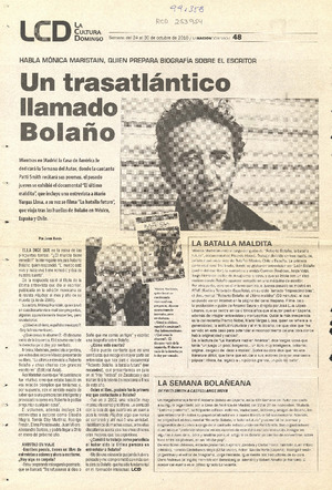 Un trasatlántico llamado Bolaño (entrevista) [artículo] / Javier García. La Nación Domingo (Diario : Santiago, Chile)-- oct. 24, 2010, p. 48 (suplemento "La cultura domingo") .