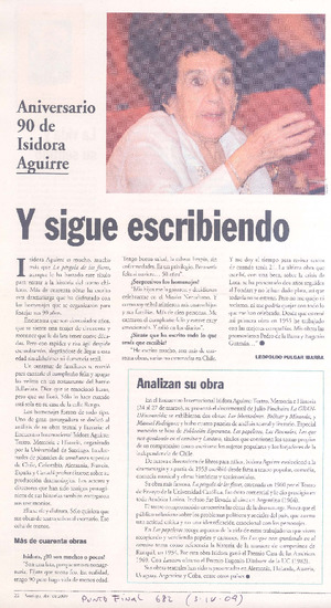 Y sigue escribiendo (entrevista) [artículo] / Leopoldo Pulgar Ibarra. Punto final (Revista, Chile)-- no. 682 (abr. 3, 2009) p. 22. .