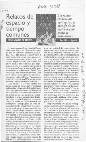 Relato de espacio y tiempo comunes [artículo] / Milton Aguilar. Las Últimas Noticias (Diario : Santiago, Chile)-- jul. 26, 1997, p. 36 retr. .