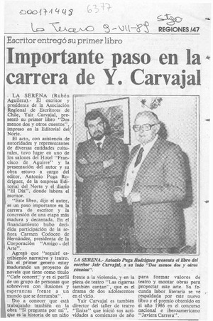 Importante paso en la carrera de Y. Carvajal [artículo] / Rubén Aguilera. La Tercera. -- Ed. de provincia. -- jul. 9, 1989, p. 47 retr. .