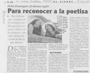 Para reconocer a la poetisa [artículo] / Estefanía Aichele. El Diario Austral (Osorno, Chile)-- ene. 17, 2003, p. A18. retr. .