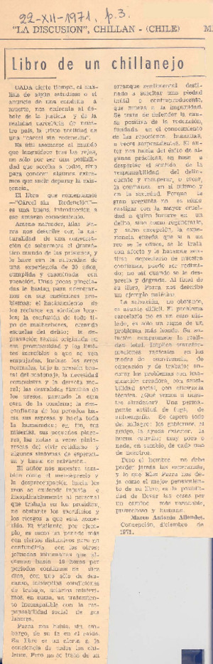 Libro de un chillanejo [artículo] / Marco Antonio Allendes. La Discusión (Chillán, Chile)-- dic. 22, 1971, p. 3. .