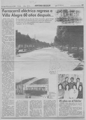 Ferrocarril eléctrico regresa a Villa Alegre 60 años después [artículo] Darío Almendras. Las Últimas Noticias (Diario : Santiago, Chile)-- Ed. de provincia. -- jul. 30, 1989, p. 27 .
