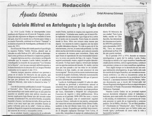 Gabriela Mistral en Antofagasta y la logia destellos [artículo] / Oriel Alvarez Gómez. Chañarcillo. -- jul. 15, 1995, p. 3. retr. .