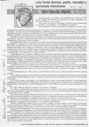 Luis Cerda Barrios, poeta, narrador y periodista freirinense [artículo] / Oriel Alvarez Gómez. Chañarcillo. -- ene. 2, 1997, p. 3. retr. .