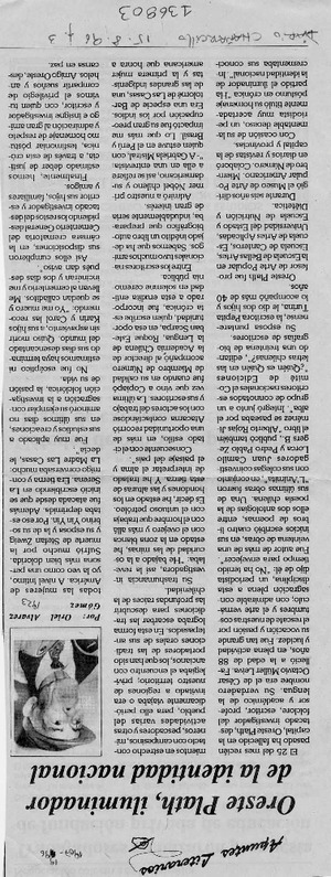 Oreste Plath, iluminador de la identidad nacional [artículo] / Oriel Alvarez Gómez. Chañarcillo.-- ago. 15, 1996, p. 3. retr. .