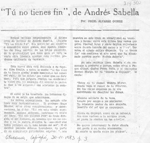 "Tú no tienes fín", de Andrés Sabella [artículo] / Oriel Alvarez Gómez. Atacama (Copiapó, Chile)-- jun. 30, 1983, p. 3. .