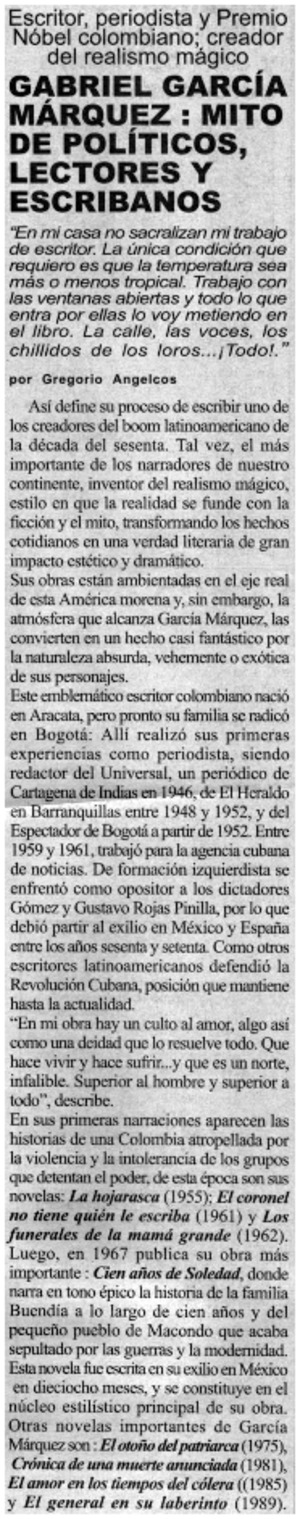 Gabriel García Márquez: mito de políticos, lectores y escribanos [artículo] / Gregorio Angelcos D. Latinoamérica, Fraternidad y Democracia (Santiago, Chile)-- no. 8, año 2 (mayo 2003) p. 9. .