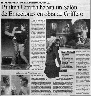 Paulina Urrutia habita un salón de emociones en obra de Griffero [artículo] / Cristian Arevalo J. La Hora de la Tarde (Santiago, Chile)-- mayo 14, 2003, p. 19. retr. .