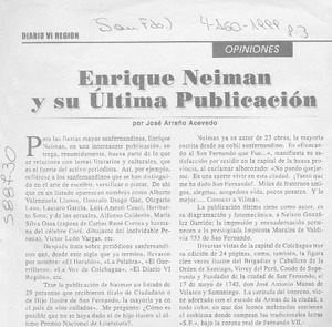 Enrique Neiman y su última publicación [artículo] José Arraño Acevedo VI Región ago. 4, 1999, p. 3 .