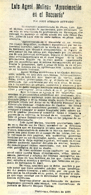 Luis Agoni Molina: "Aproximación en el recuerdo" [artículo] / José Arraño Acevedo. El Heraldo (Diario : Linares, Chile)-- oct. 31, 1985, p. 6. .