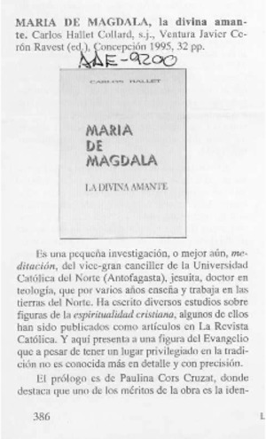María de Magdala [artículo] / Andrés Arteaga Manieu. La Revista Católica. -- no. 1108 (oct. dic. 1995) p. 386 il. .