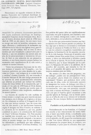 Un espíritu nuevo, documentos pastorales 1999-2000 [artículo] Andrés Arteaga Manieu La Revista Católica no. 1133 (ene. mar. 2002) p. 86-88 .