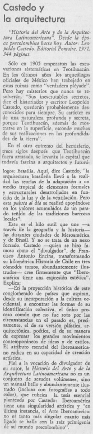 Castedo y la arquitectura [artículo] / A.S. Ercilla (Santiago, Chile)-- no. 1910 (feb. 23, 1972) p. 37-38. retr. .