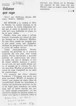 Volumen que ruge [artículo] / A.S. Ercilla (Revista : Santiago, Chile)-- no. 1805 (ene. 21, 1970) p. 70. .