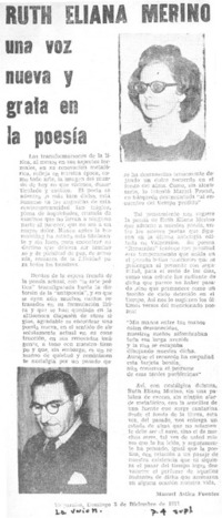 Ruth Eliana Merino una voz nueva y grata en la poesía [artículo] / Manuel Astica Fuentes. La Unión (Valparaíso, Chile)-- dic. 5, 1971, p. 4 (suplemento) retr. .