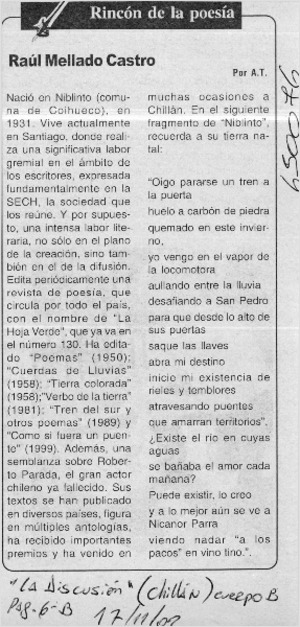 Raúl Mellado Castro [artículo] A. T. La Discusión (Chillán) nov. 17, 2002, p. 6B .
