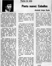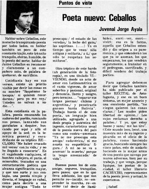 Poeta nuevo: Ceballos [artículo] / Juvenal Jorge Ayala. La Estrella de Iquique (Diario : Iquique, Chile)-- abr. 10, 1985, p. 3. retr. .