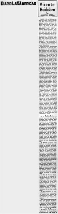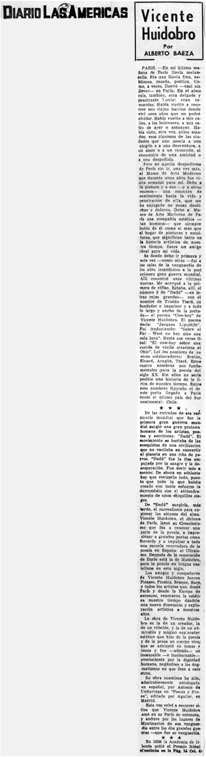 Vicente Huidobro [artículo] / Alberto Baeza. Diario Las Américas (dario : Miami, Estados Unidos)-- mar. 7, 1971, p. 4 y 14. .
