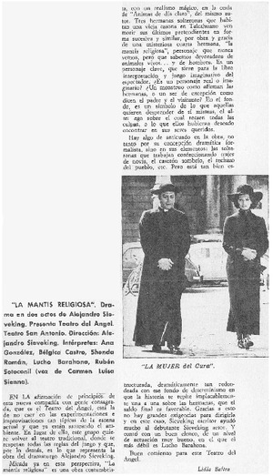 La mantis religiosa" [artículo] / Lidia Baltra. Telecrán (Santiago, Chile)-- no. 89 (mayo 1971) p. 41. .