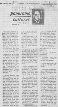 Panorama cultural [artículo] / Jorge A. Barrera A. La Cruz del Sur (Ancud, Chile)-- abr. 13, 1975, p. 6. retr. .