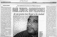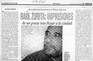 Raúl Zurita, impresiones de un poeta tras llegar a la ciudad [artículo] Ricardo Barrera El Nortino (Iquique) abr. 13, 2001, p. 24 retr. .