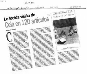 La lúcida visión de Cela en 120 artículos [artículo] / Alfredo Barría M. El Sur (diario : Concepción, Chile)-- feb. 6, 1994, p. 9 (suplemento) retr. .