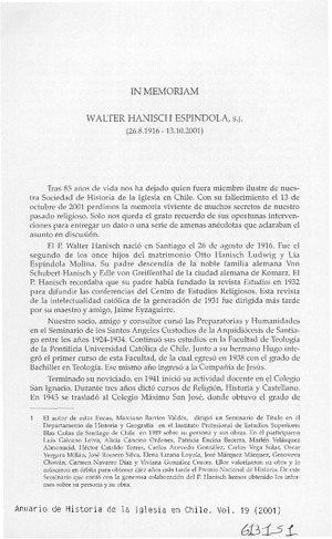 Walter Hanisch Espíndola, s. j. [artículo] Marciano Barrios Valdés Anuario de Historia de la Iglesia en Chile vol. 19 (2001) p. 9-13 .