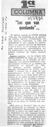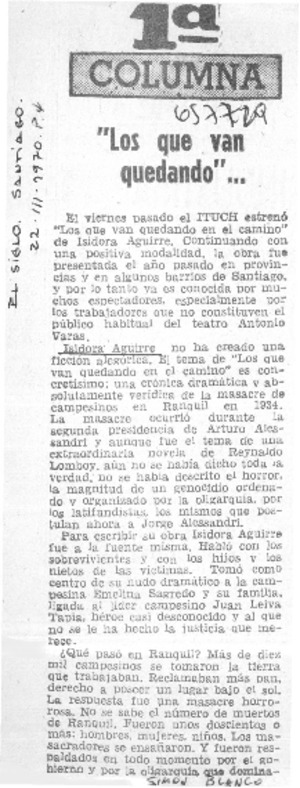 "Los que van quedando" [artículo] / Simón Blanco. El Siglo (diario : Santiago, Chile)-- mar. 22, 1970, p. 4. .