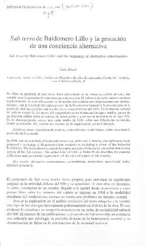 Sub Terra de Baldomero Lillo y la gestación de una conciencia alternativa [artículo] / Luis Bocaz Estudios Filológicos (Revista : Chile)-- no. 40 (2005) p. 7-27 .