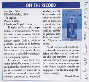 Off the record [artículo] Ricardo Bravo Ercilla (Santiago) no. 3128 (ene. 10, 2000) p. 79 il. .